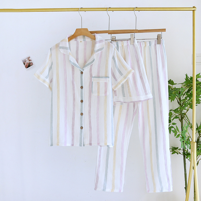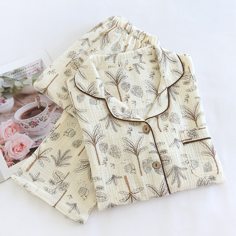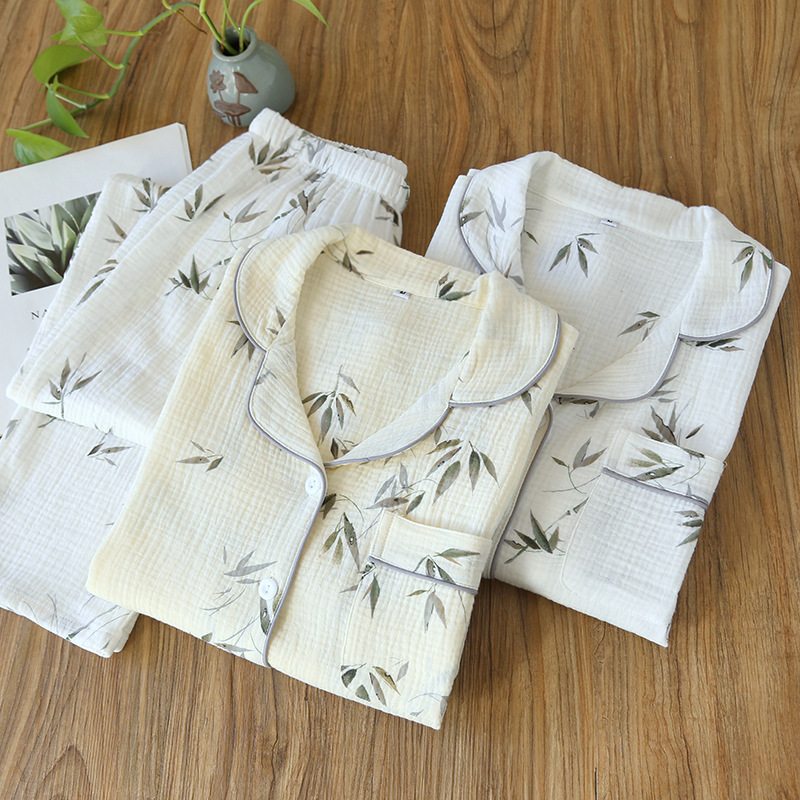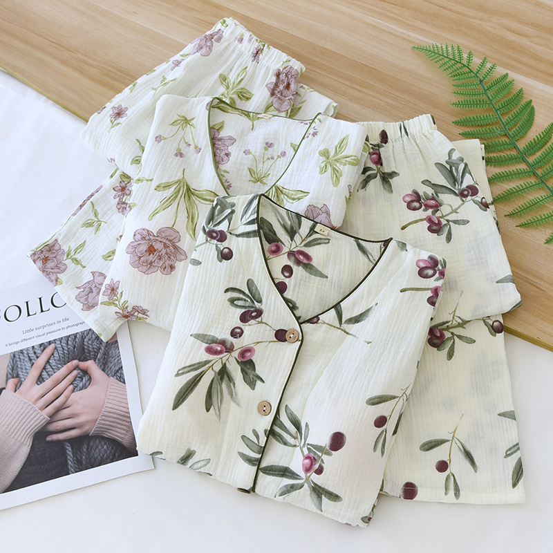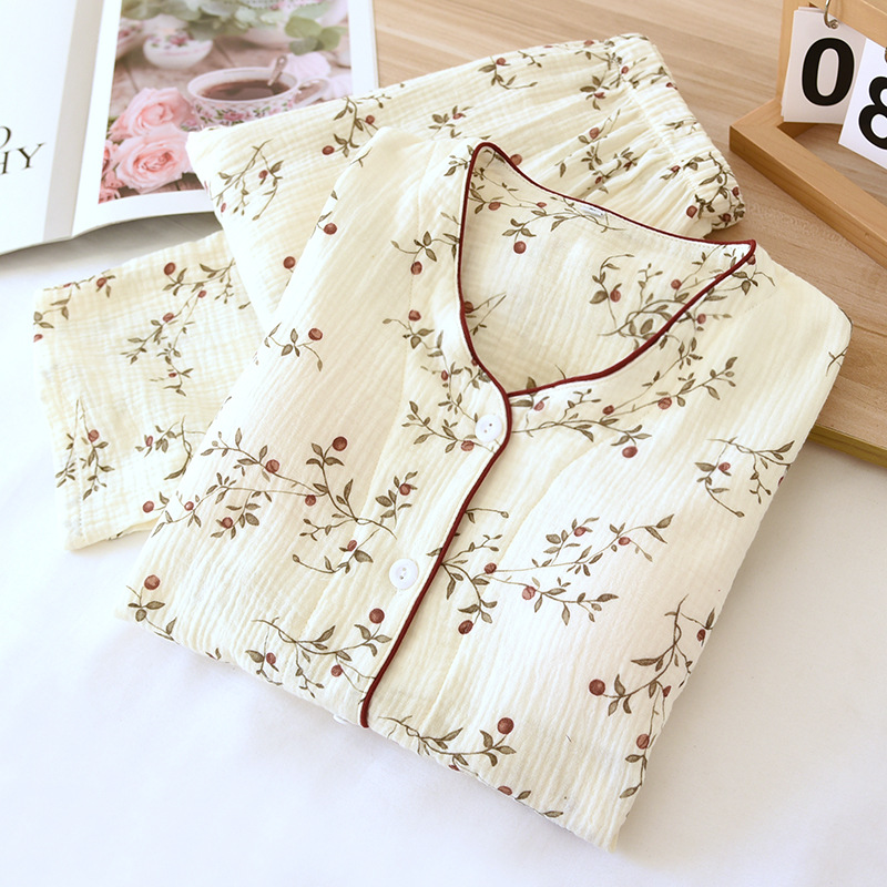 田園パジャマ女性春秋夏純綿ガーゼ二重縮み薄い長袖カーディガン甘い家庭服セット