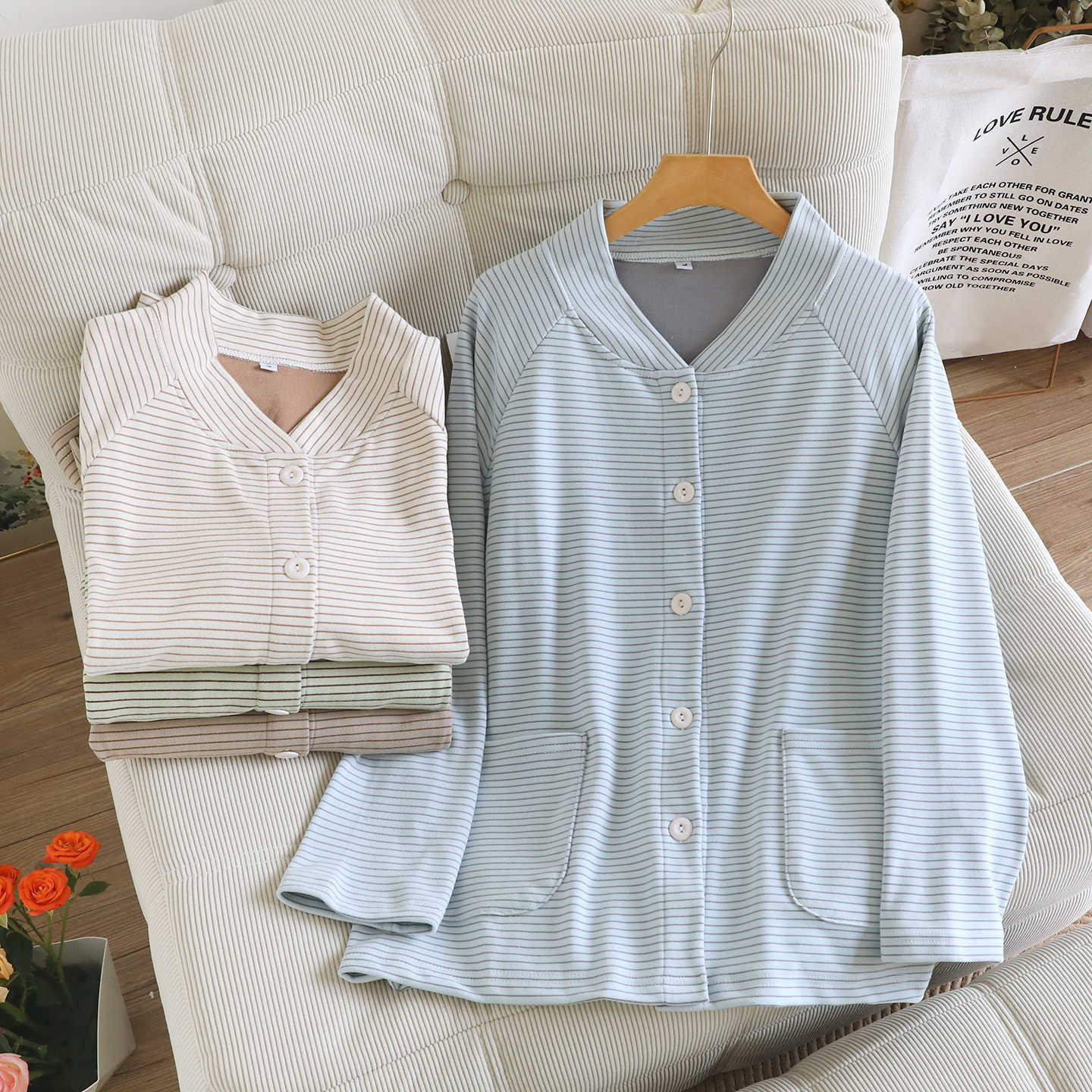 デロン素材のパジャマトップス、レディース薄手ベルベット、襟なし長袖、春秋冬用カーディガン、保温性のあるアウター、ルームウェア
