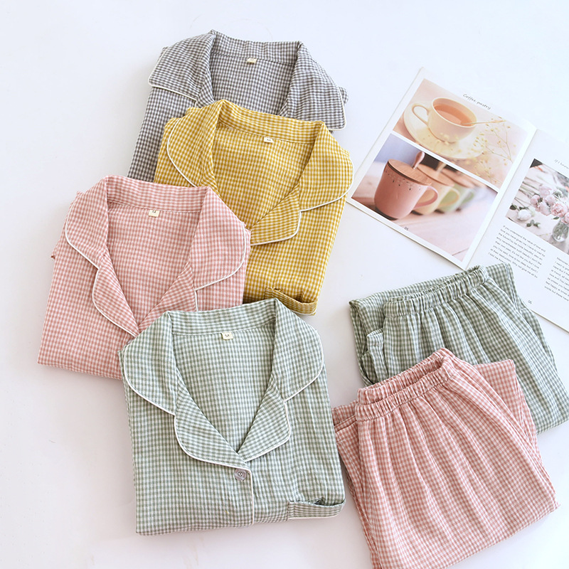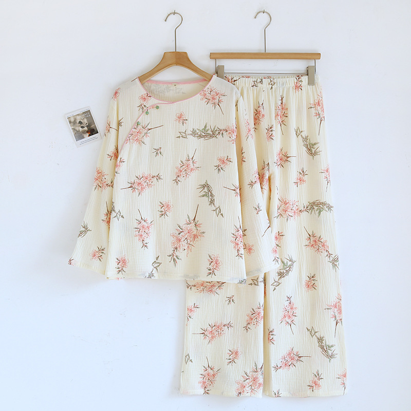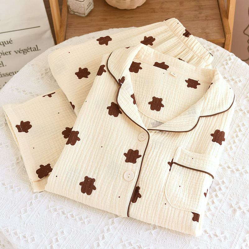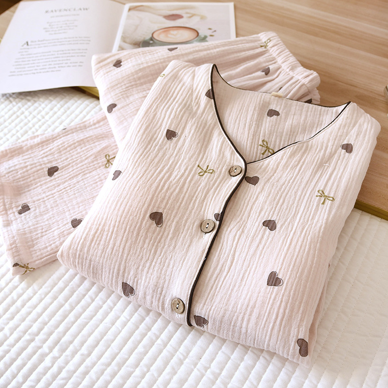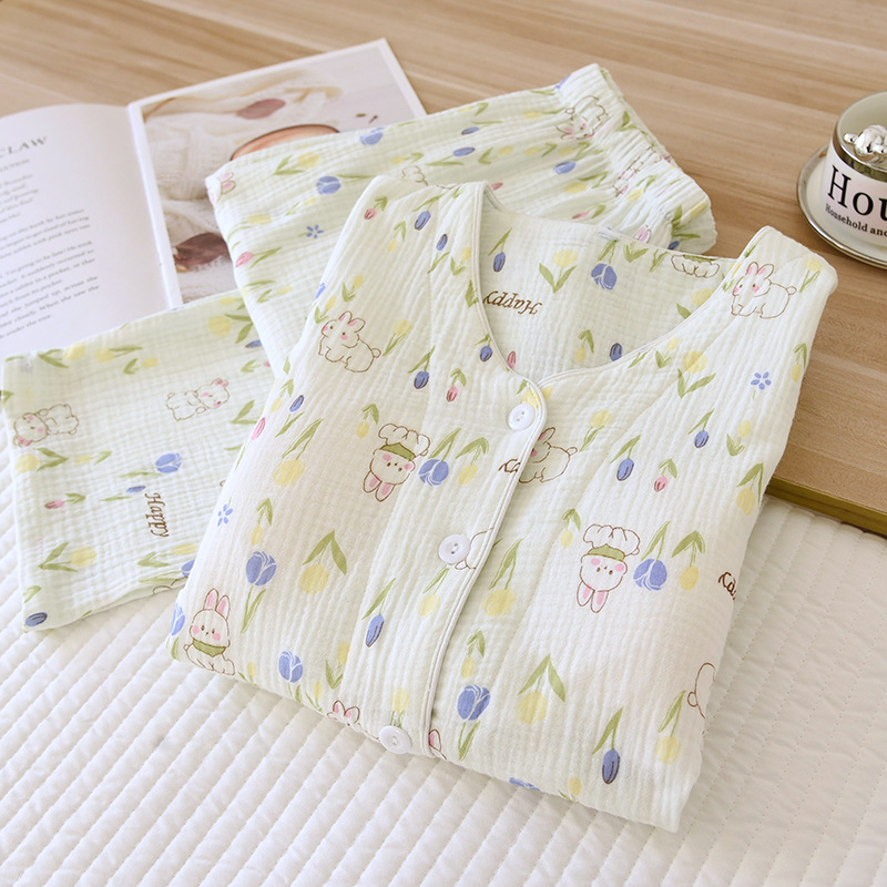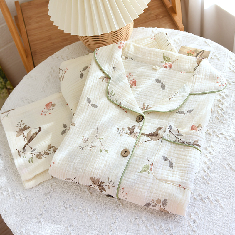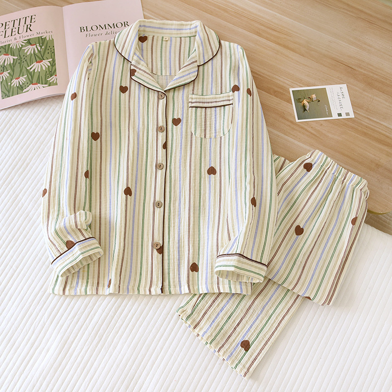 愛らしい春夏二重ガーゼのかわいい女性用長袖パジャマセット春秋冬夏純綿カーディガンホームウェア薄手タイプ