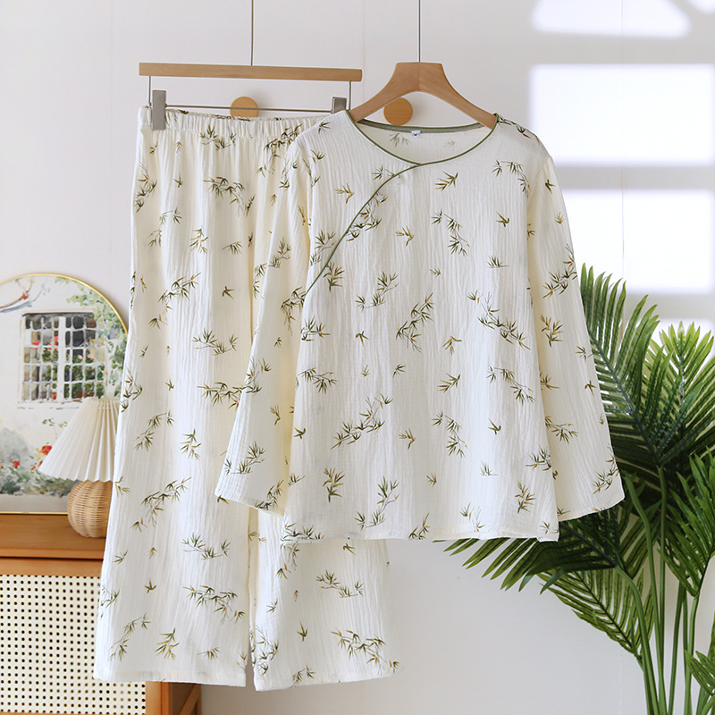 無胸胸パッド純綿二重ガーゼパジャマ女性春と秋の薄い長袖綿家庭服セット夏