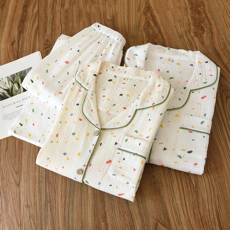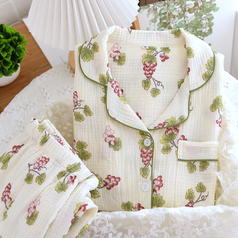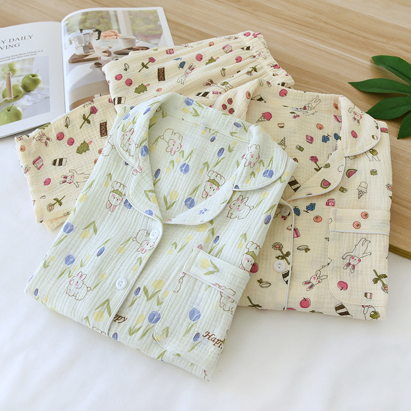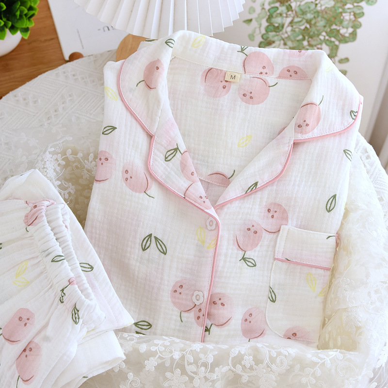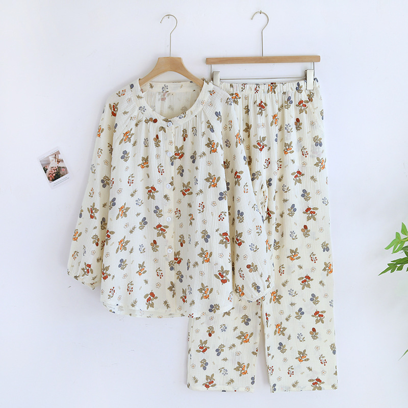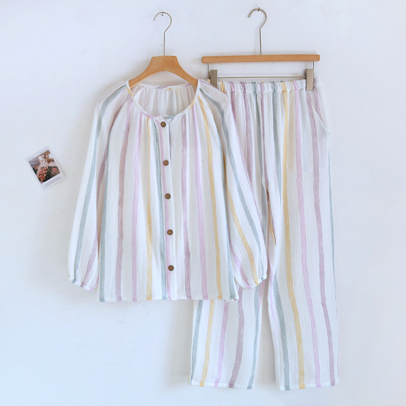 丸首純綿ガーゼパジャマ女性春秋長袖長ズボンカーディガン二重綿麻田園家庭服セット