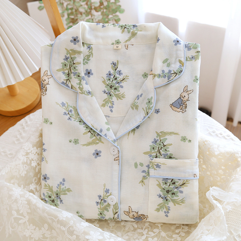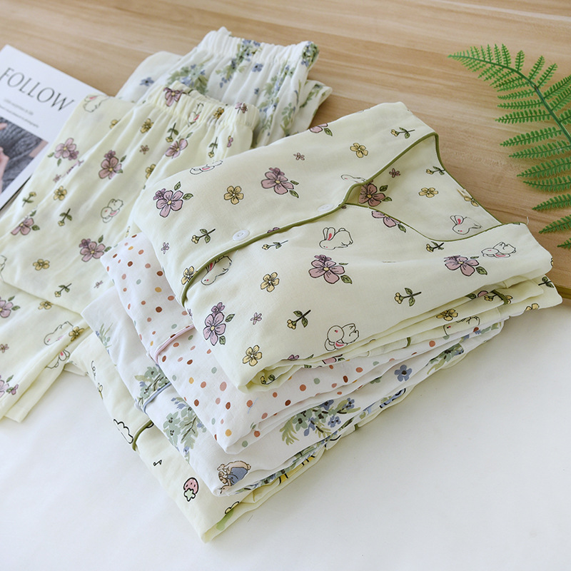 プリントパジャマ女性春夏純綿ガーゼ薄手ゆるい長袖カーディガン家庭服セット清新秋冬