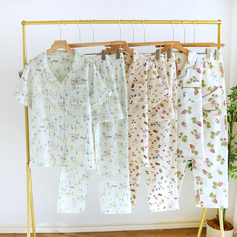 パジャマ女性春秋夏純綿ガーゼ薄手長袖長ズボン半ズボン三点セットホームウェア田園