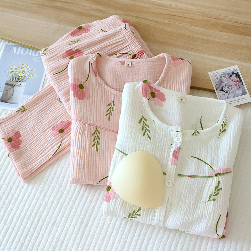 胸パッド付きパジャマレディース春秋夏純綿ガーゼ薄手長袖ベビー襟ホームウェアセットゆったり女