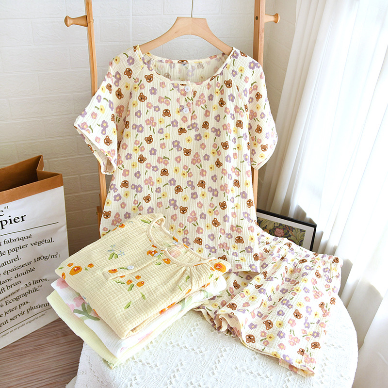 『花熊熊』甘美風田園砕花パジャマ女性夏純綿ガーゼはゆったりとした家庭服を着ることができる