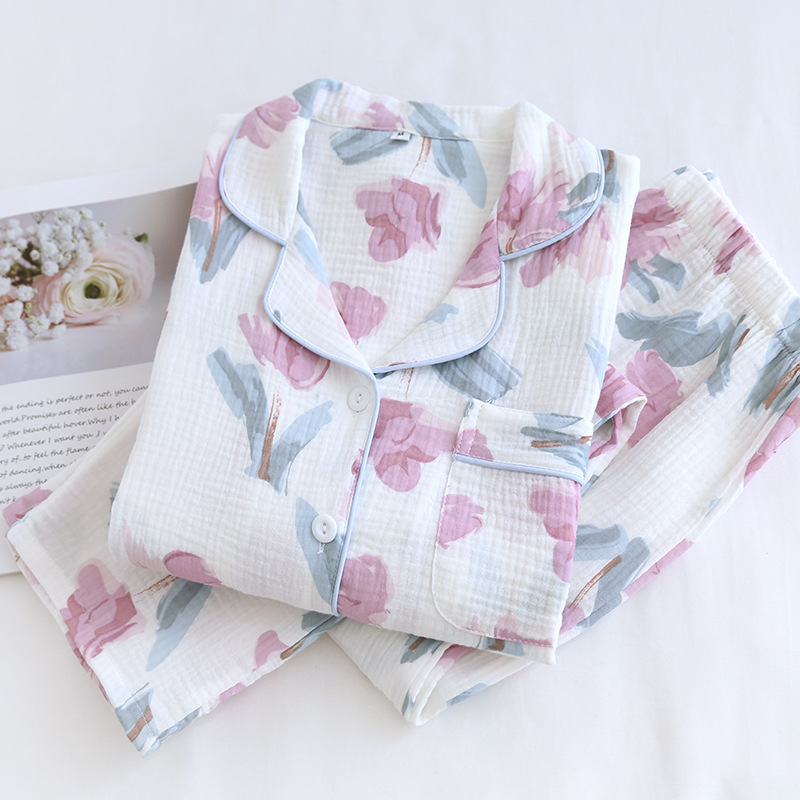 女性のためのパジャマ春と秋の秋の純粋な綿ガーゼクレープ長袖女性のホーム服冬と夏の薄い綿のスーツ