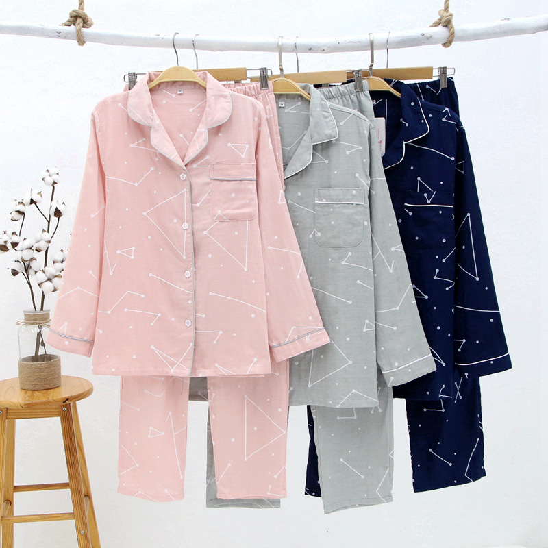 日系春秋男女カップル純綿二重ガーゼホームウェアセット長袖長ズボンパジャマゆったり薄手
