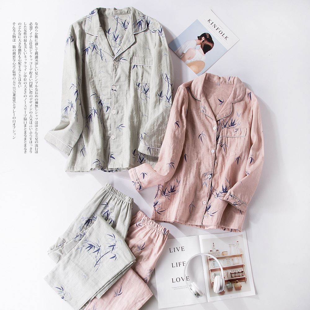 レディース純綿パジャマ春秋二重ガーゼ中袖長ズボン日本式着物ホームウェアセット外国貿易