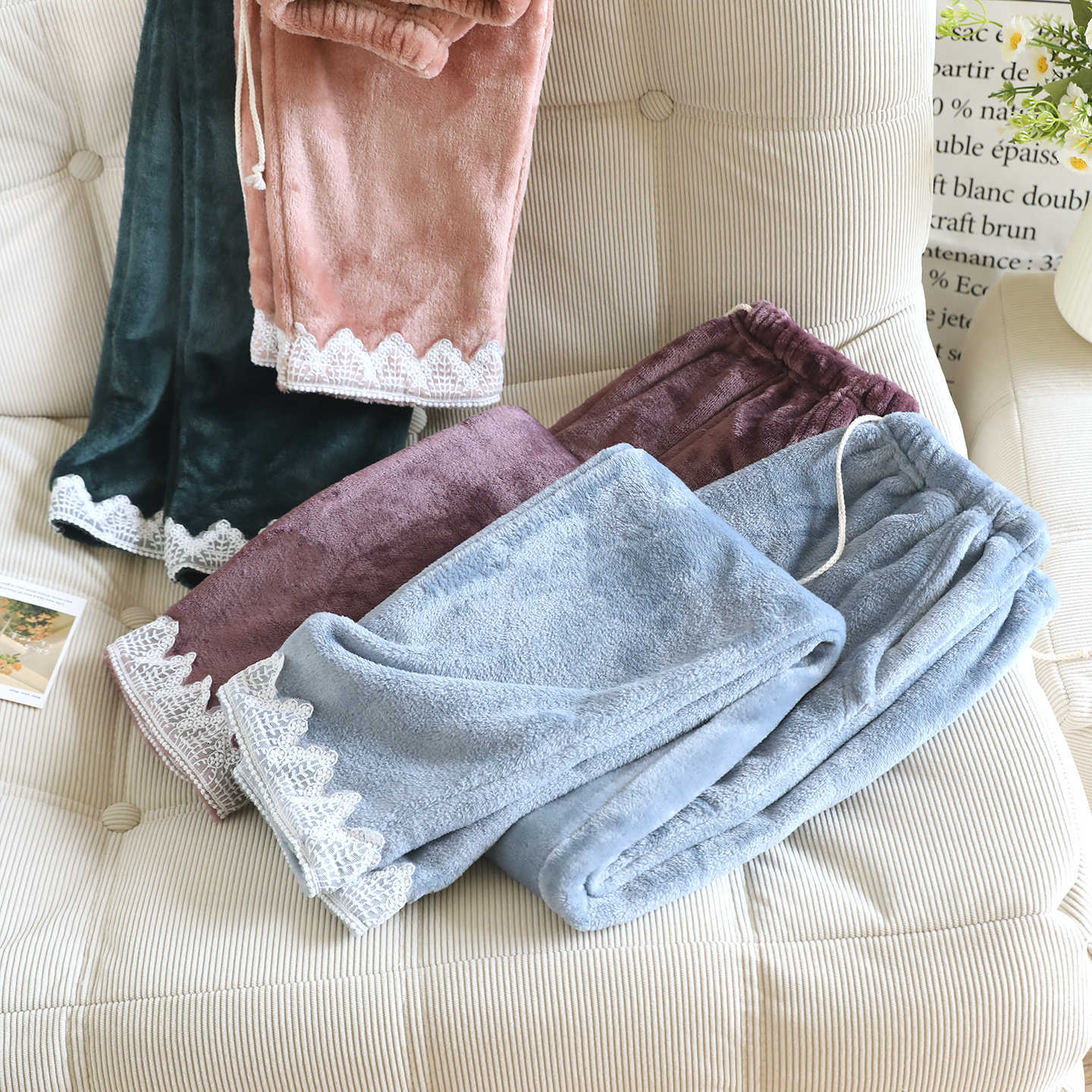 寝ズボンの女性フランネル秋冬にベルベットをつけて保温がゆったりしている直筒家のズボンの暖かいズボン2024の新型