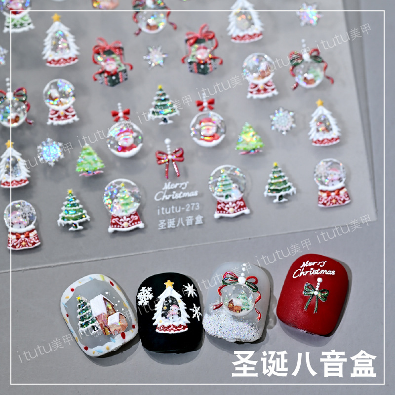 Itutu新品クリスマスオルゴール貝殻光ネイルシールレリーフパウダーブルークリスマスツリープレゼント雪花272
