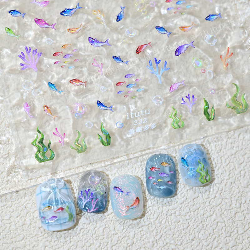 Itutu新商品の貝殻光魚の面白いレリーフネイルシール水光幸運錦鯉水泡指先模様