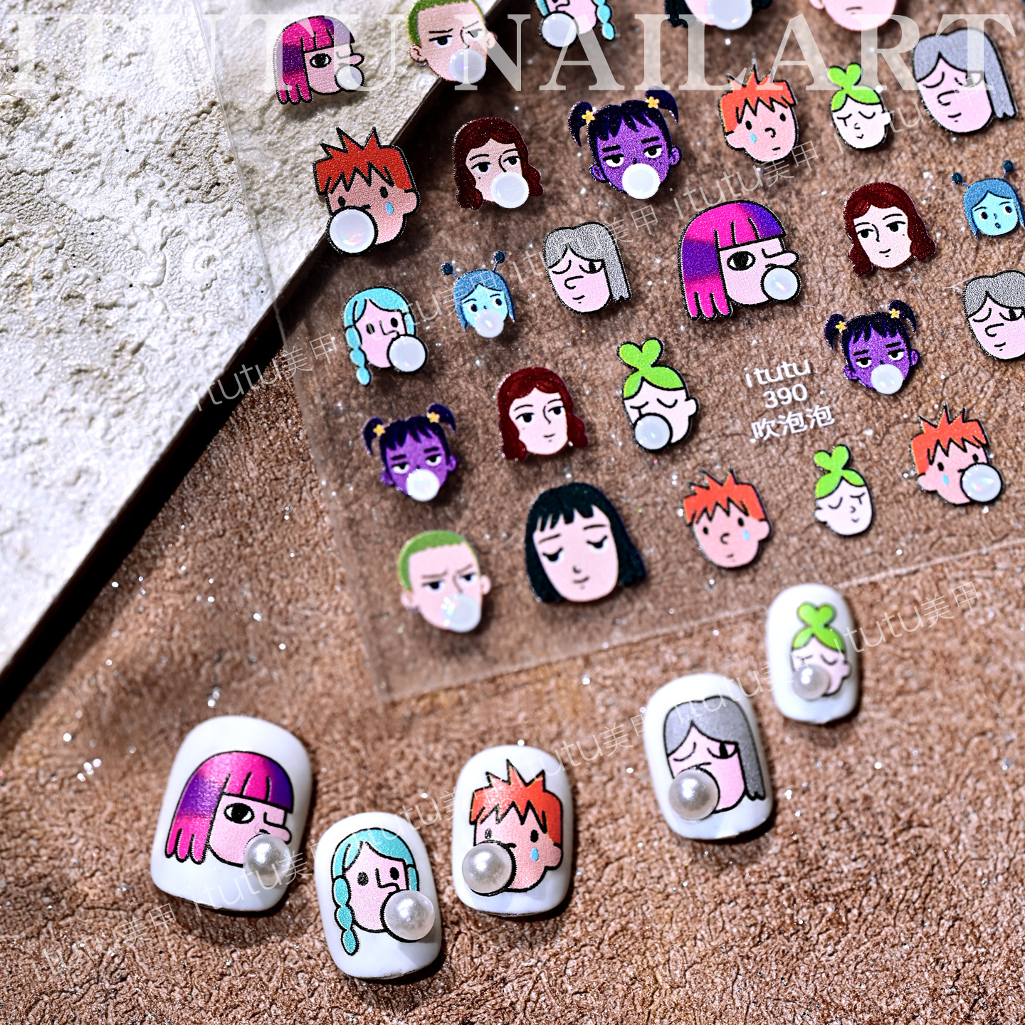 itutu 泡を吹く奇妙な女の子エンボスシェルライトネイルアートステッカー面白いスタイル少女指先パターン 390