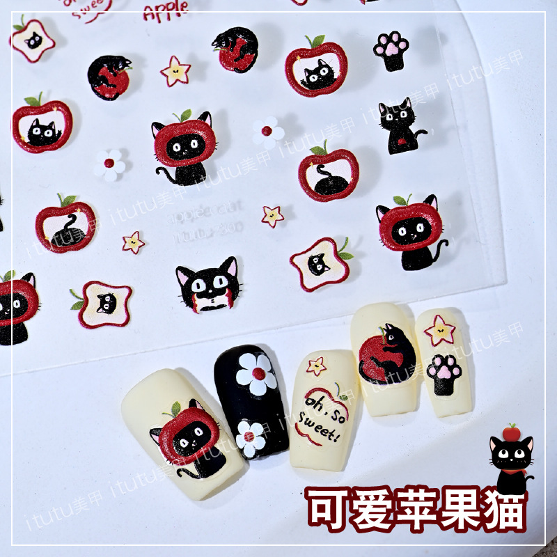 新しい可愛い漫画風アップル猫エンボスネイルステッカー、小さな黒猫の爪飾り、小さな花柄の粘着性3Dパターン