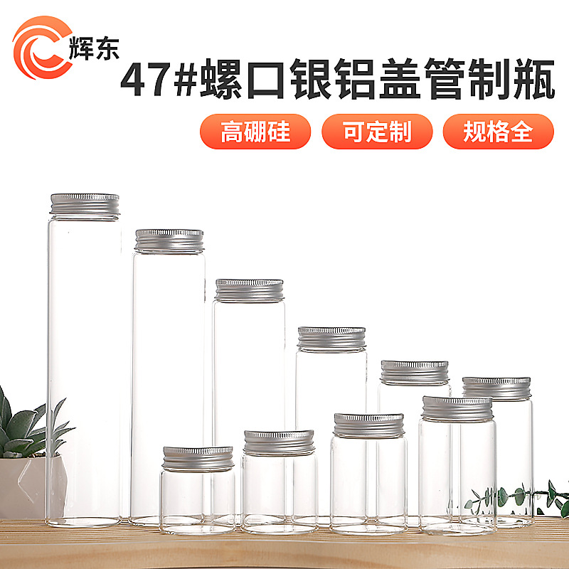 高ホウ素シリコン試薬瓶直径47mmねじ口銀アルミ蓋管製瓶透明願い事瓶巻き縁蓋漂流瓶