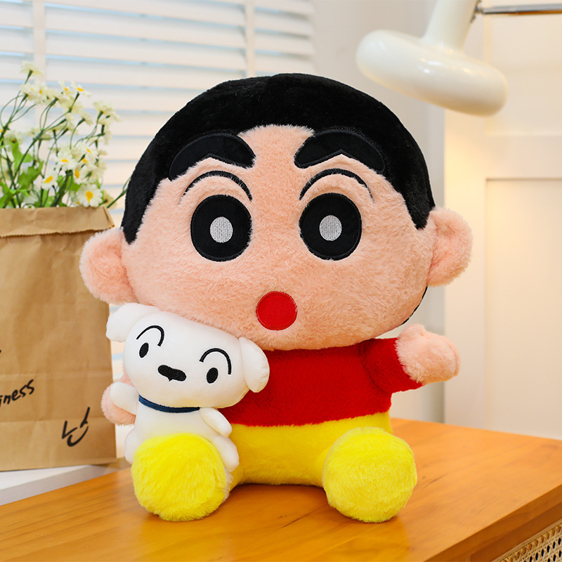 新商品のしんちゃんは白いぬいぐるみを抱いて、枕のぬいぐるみを抱いています。