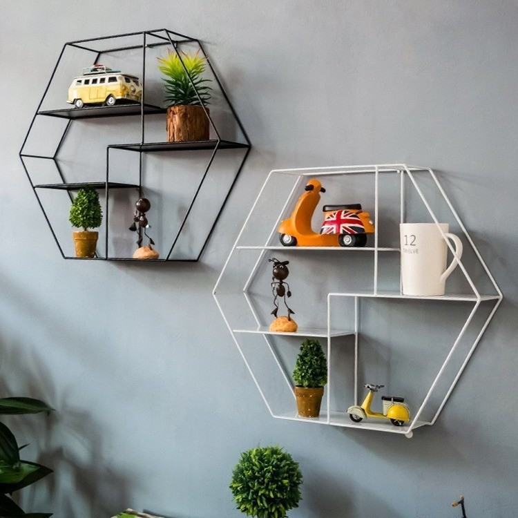 錬鉄の輝く金属の六角形の物置棚の壁掛け式の壁の杯の棚の鉄芸の収納の排水棚のフックの展示棚