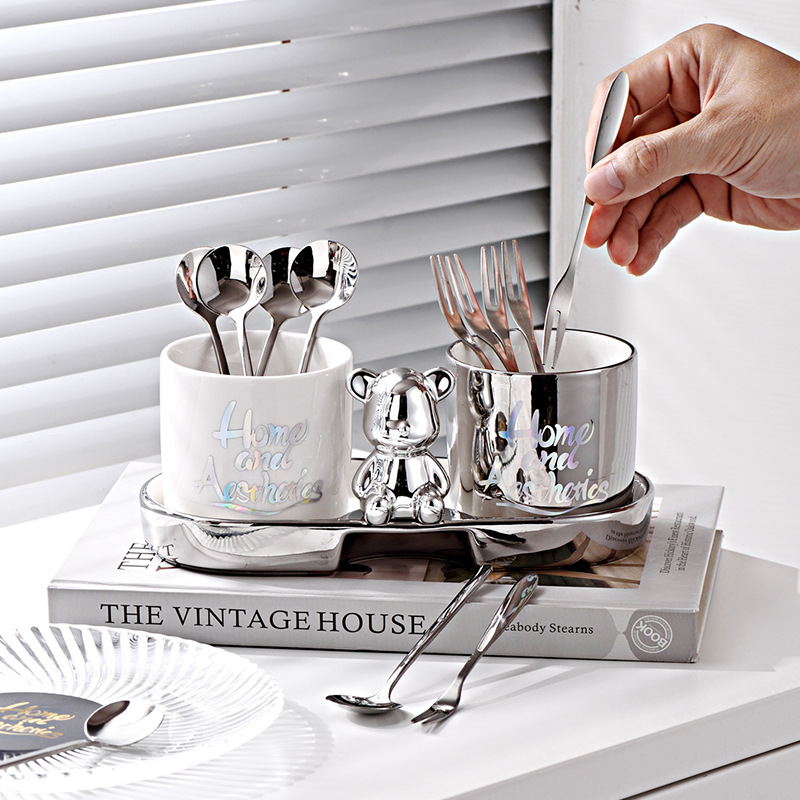 北欧風熊果物フォーク缶セット軽豪華高颜値メッキ陶磁器収納缶ステンレスフォークスプーン卸売り