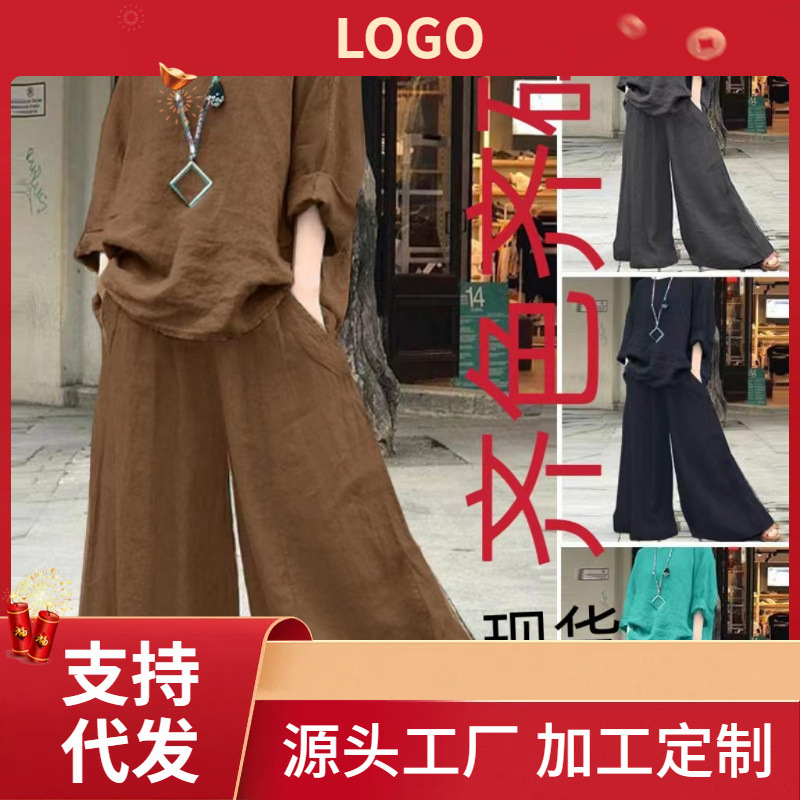 2025春秋に国境を越えたアマゾンさんの復古プラスサイズの麻シャツセットのゆったりしたズボンの2セットの女性