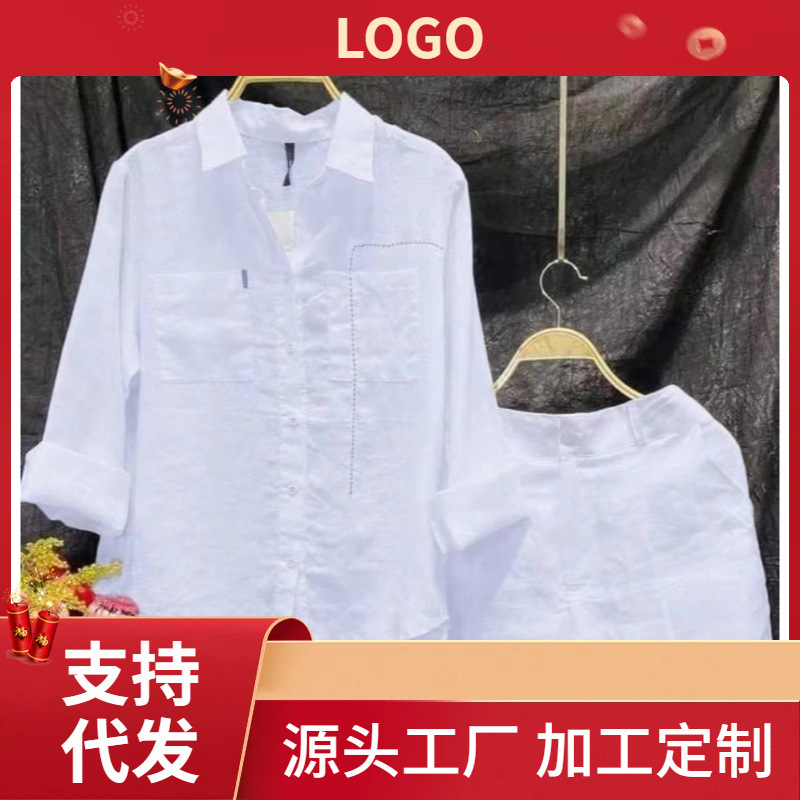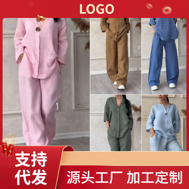 アマゾンクロスボーダー2025春の新型ファッション女性スーツ綿麻純色シャツ痩せカジュアルパンツ