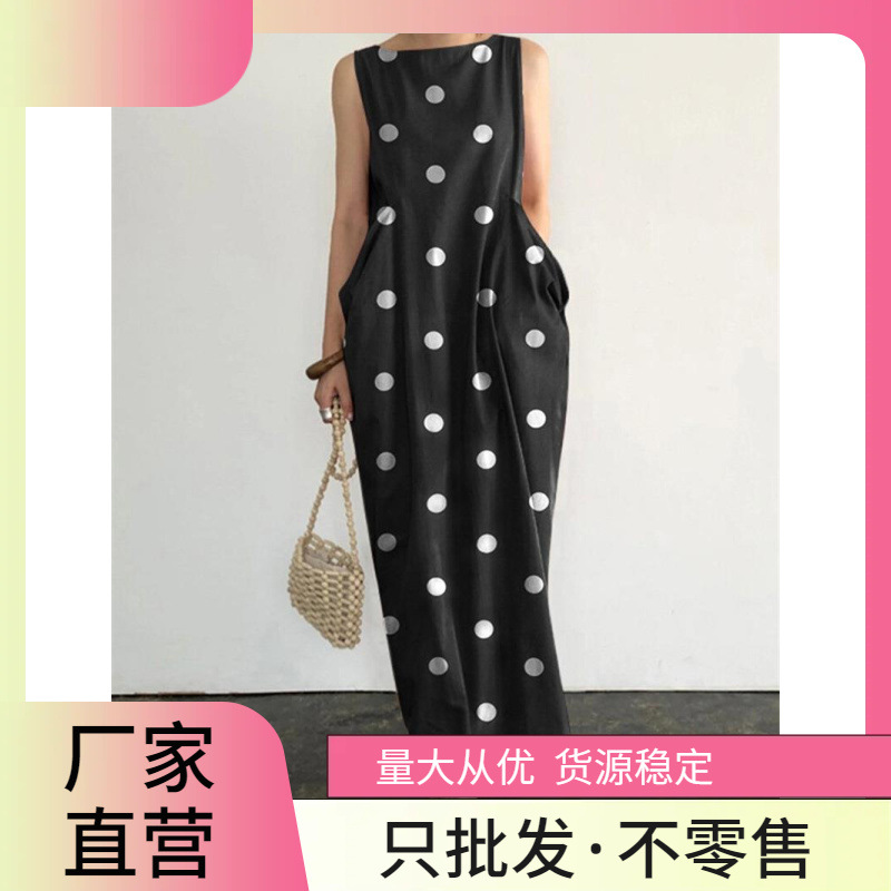 2023欧米のアマゾンの越境する新型の波点の長いスカートのポケットのゆったりしているカジュアルな丸首のワンピースの対外貿易の卸売り