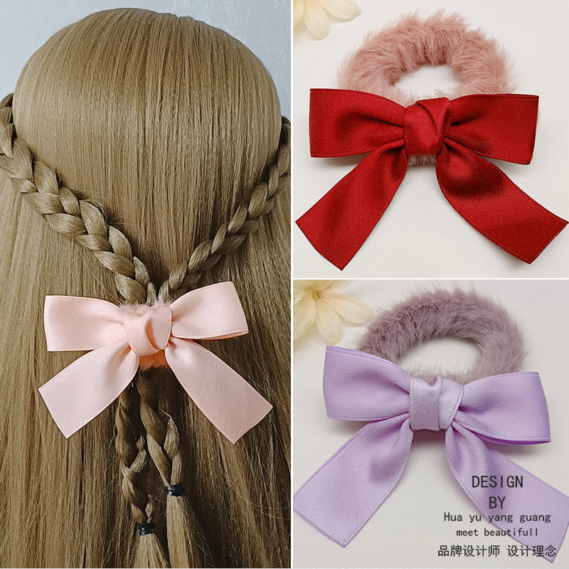 秋冬の飴色の可愛い毛の輪の蝶結びはウサギの毛の縄の女性の団子の頭の皮の筋の縄の女性の髪飾りに似せます。