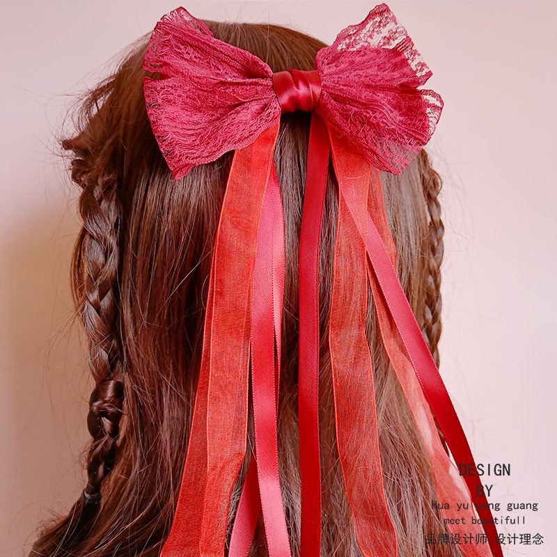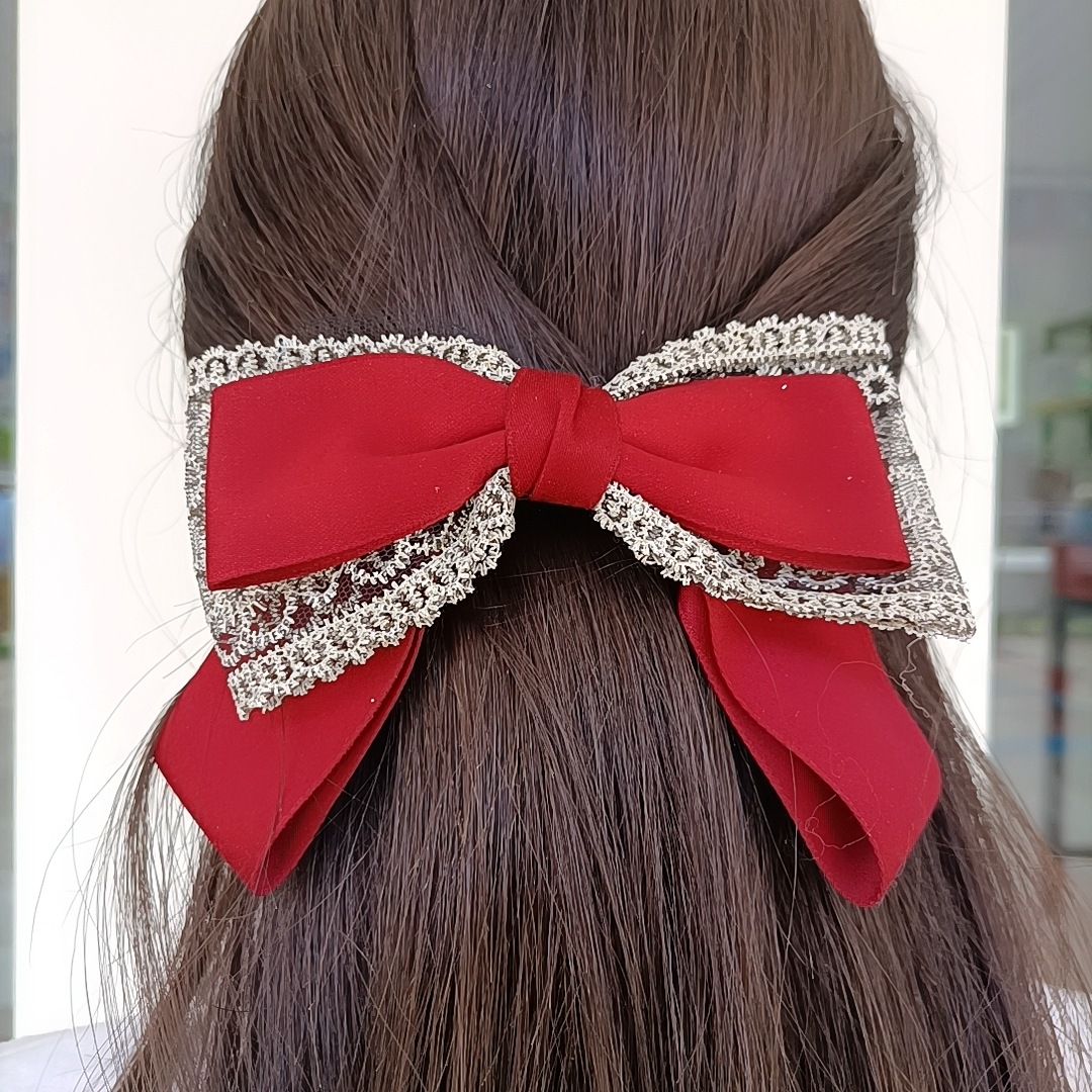 ロリータのワインの赤いレトロな蝶結びの二重のレースのヘアピンのネットの赤い飾りのトップクリップの後頭部のスプリングクリップ