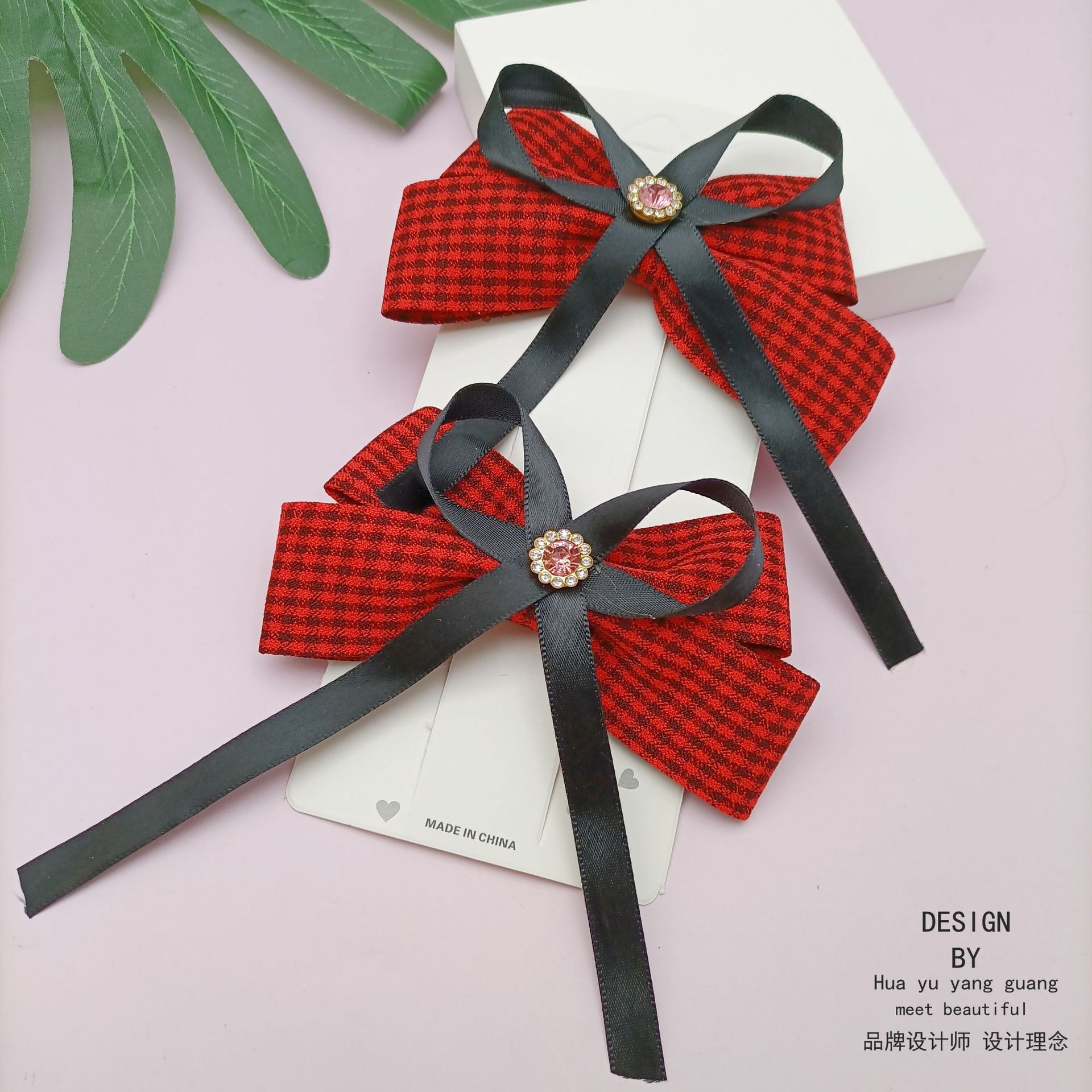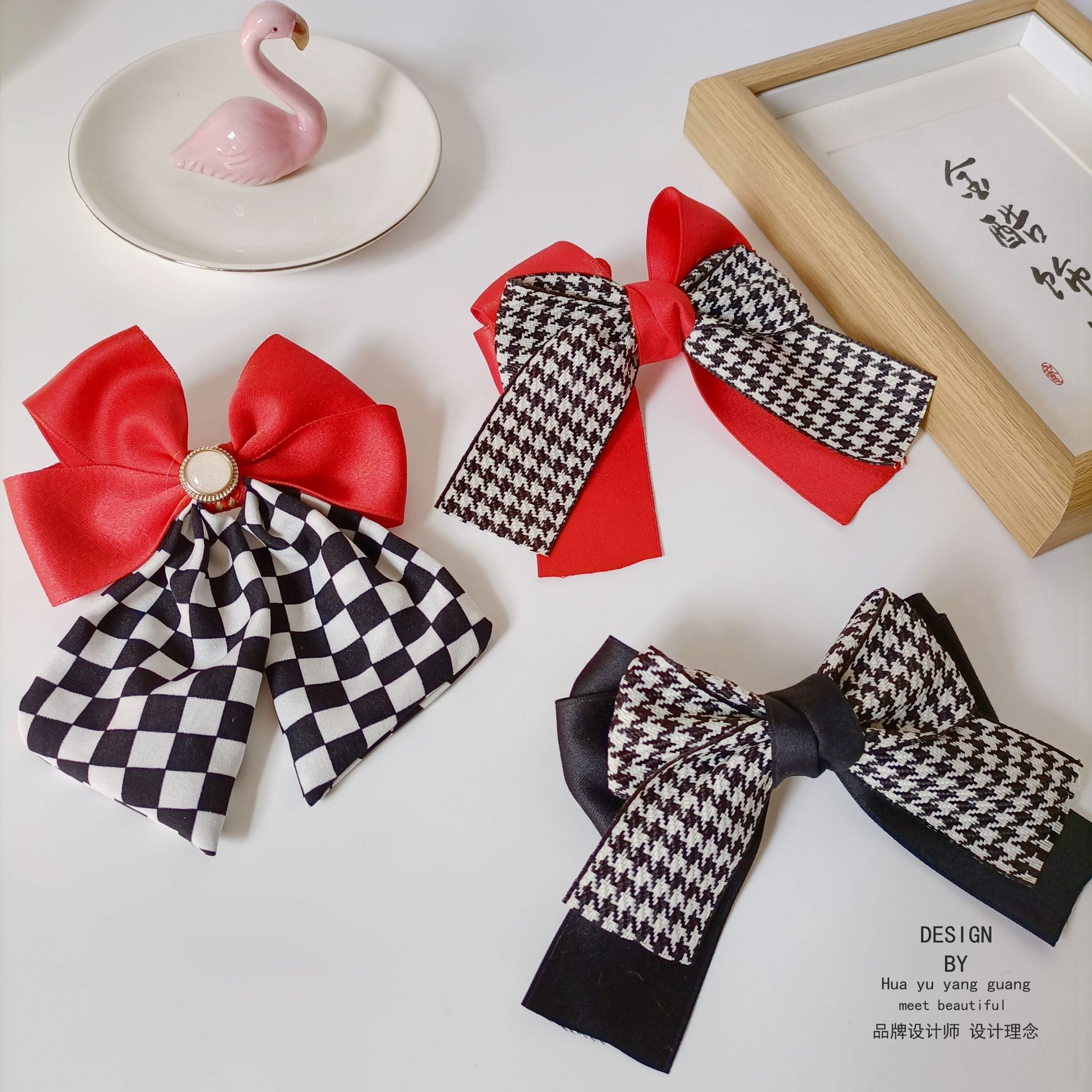 旧正月のクリスマスのリボンのヘアピンのワインの赤い格子縞の女性の後頭部のスプリングは高い馬尾の頭上の髪飾りを挟みます。