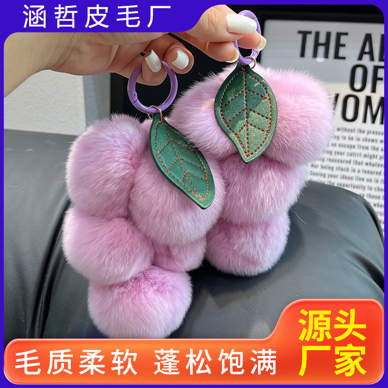 本物のウサギの毛の紫色のブドウの車のキーは女性のかわいいぬいぐるみのカバンを掛けて飾ります。