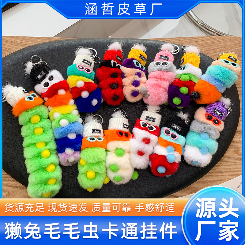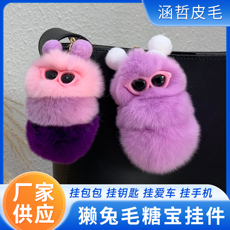 かわいいウサギの毛皮の毛虫の自動車のキーホルダーはぬいぐるみのかばんを掛けてプレゼントを飾ります。