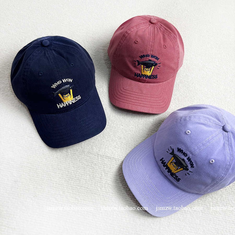 韓国版かわいい猫が魚を捕まえてアヒルの舌の帽子を刺繍します。