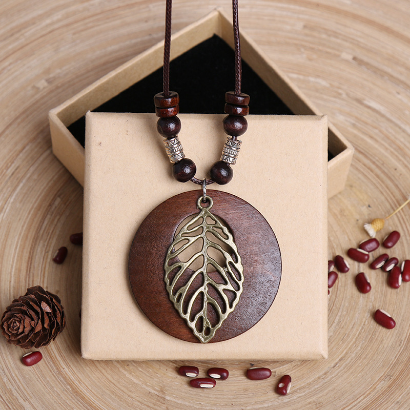 国境を越えたアマゾンの新しいレトロな綿麻は民族風木質合金の木の葉の長いネックレスの女性のセーターの鎖を飾っている