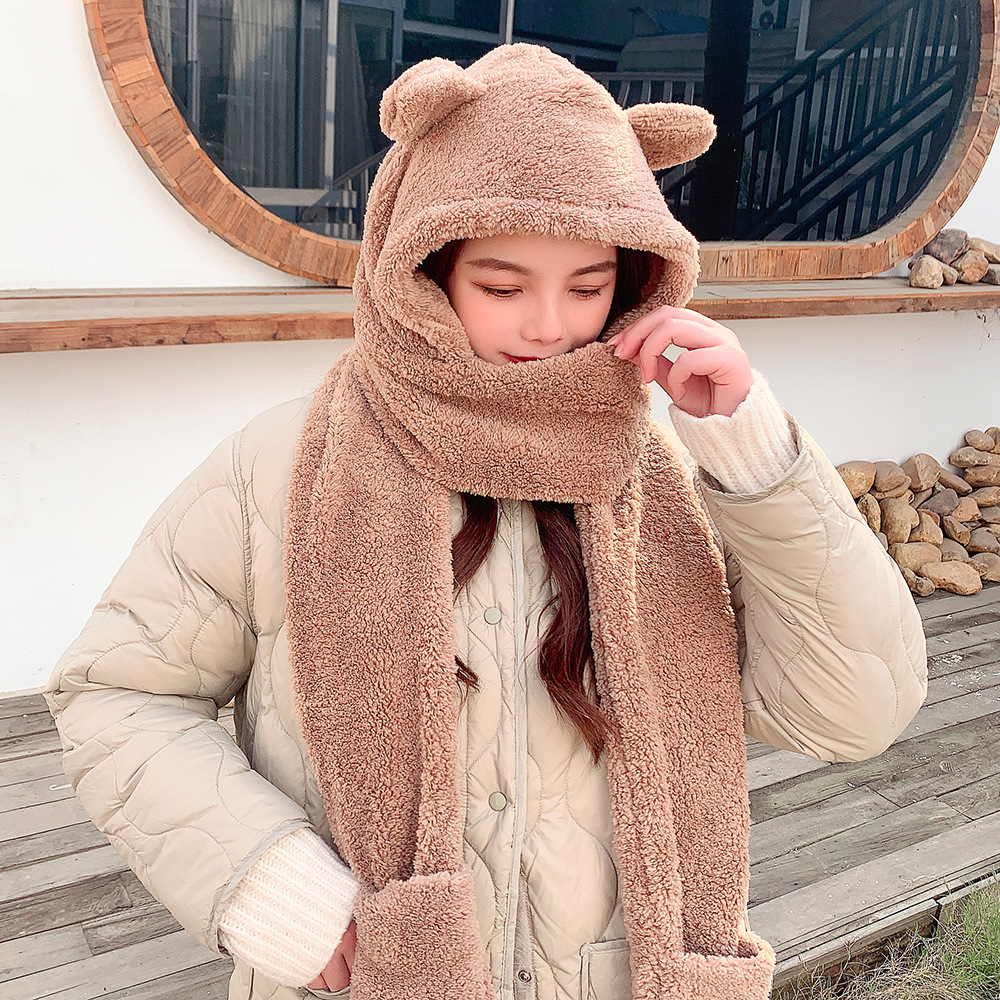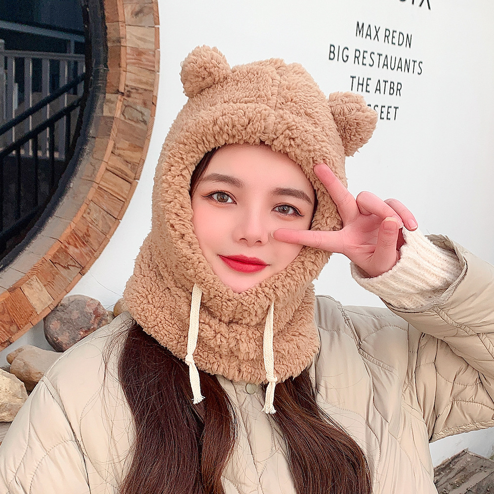 新しい韓国スタイルの秋と冬の女性の屋外ラムズウール暖かいサイクリング耳プルオーバー帽子スカーフワンピース巾着帽子
