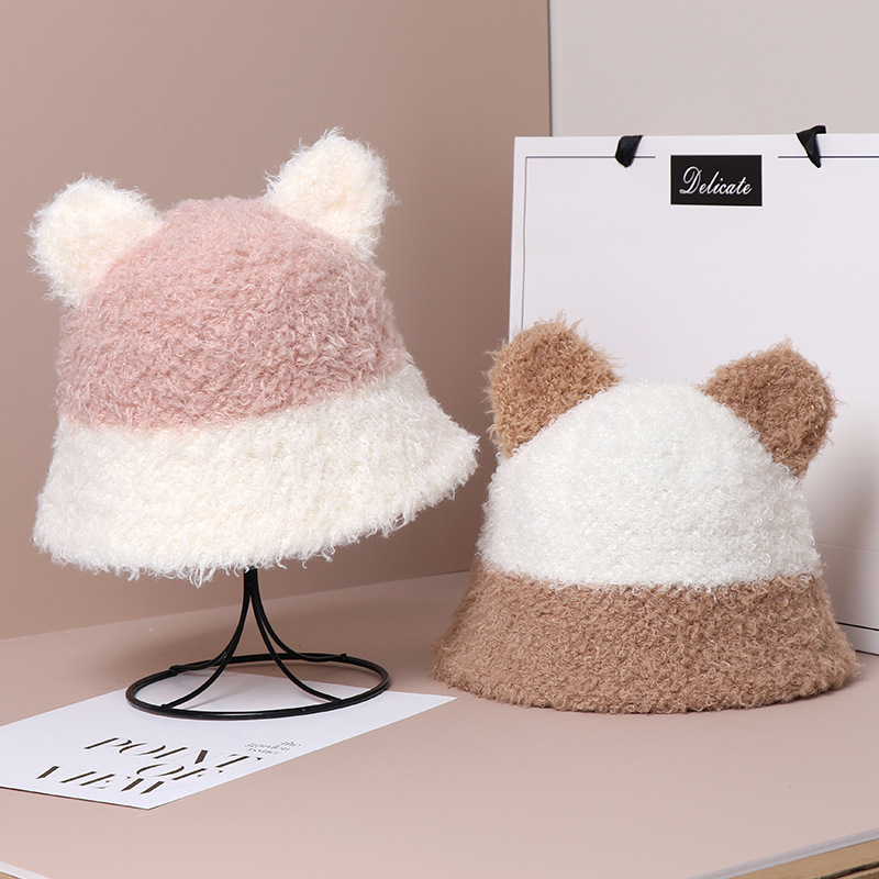 女性用の新しい秋と冬の帽子、かわいい漫画の顔が見える小さな暖かいぬいぐるみ盆地帽子、甘い耳のカラーブロックバケットハット、トレンディです