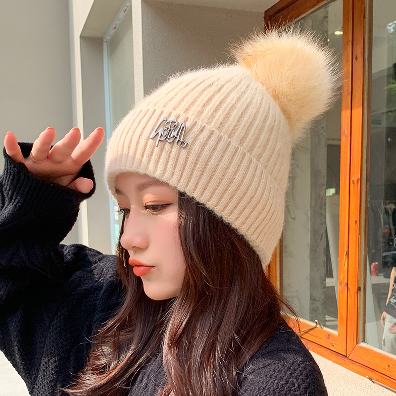 新しい女性のニットかわいい日本製ファーボールプルオーバー屋外プラスベルベット暖かいレター秋と冬のウールの帽子