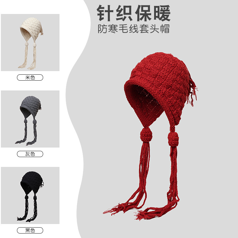 新しい帽子女性の秋と冬暖かいウールタッセルかわいいプルオーバー帽子手作りニット耳保護帽子日本卸売