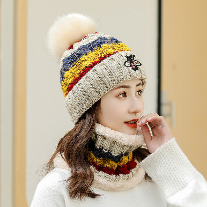 女性の秋と冬のウール耳保護暖かいニット蜂毛玉プルオーバー帽子スカーフツーピーススーツ卸売