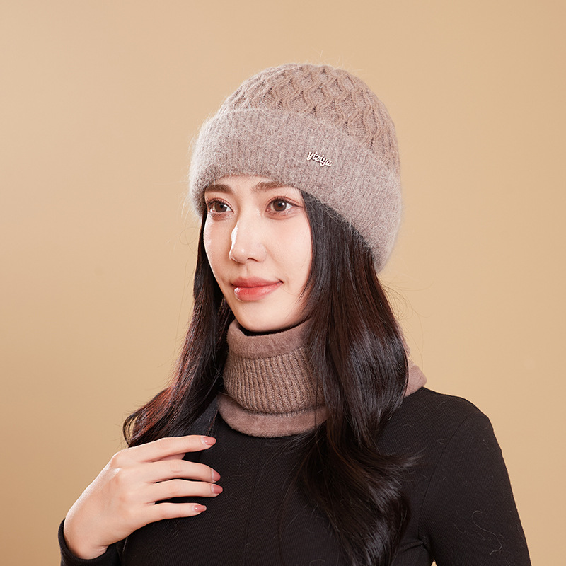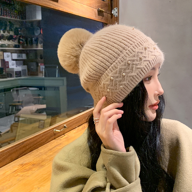 日本の新しい無地ニットウサギの毛プルオーバー帽子女性のための秋と冬厚く暖かい耳保護ファッションウール防寒帽子