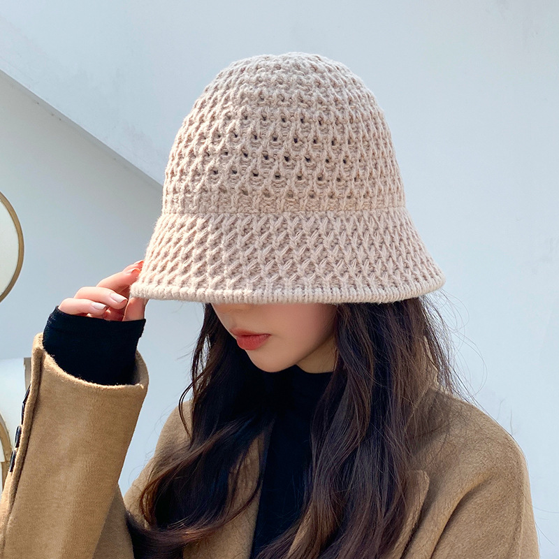 韓国版の新しい秋と冬の豪華な顔が見える小さなニットバケットハット、女性用アウトドアレジャー暖かい無地盆地帽子