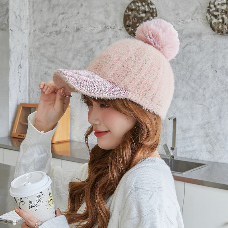 韓国スタイルの女性の新しい秋と冬の甘い毛玉ニット大きなつばの野球帽アウトドアスポーツ暖かいアヒルの舌帽子