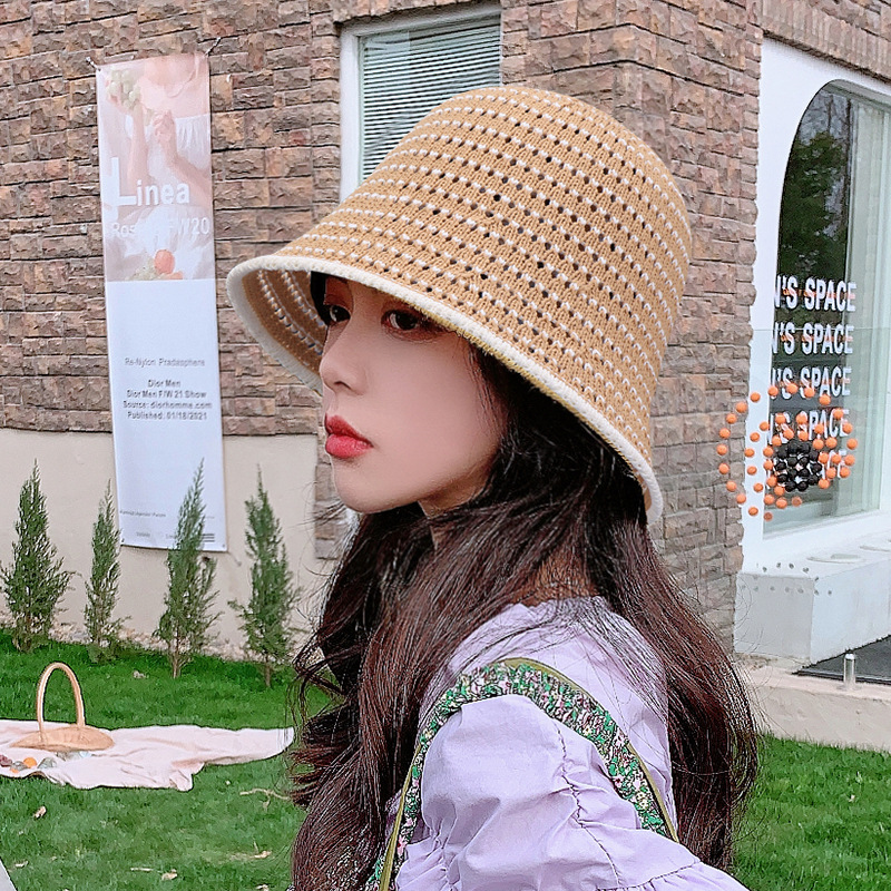 夏の新型女性レースの色合わせファッション日系バケツ帽屋外旅行シンプルカジュアル日焼け止めニット帽子