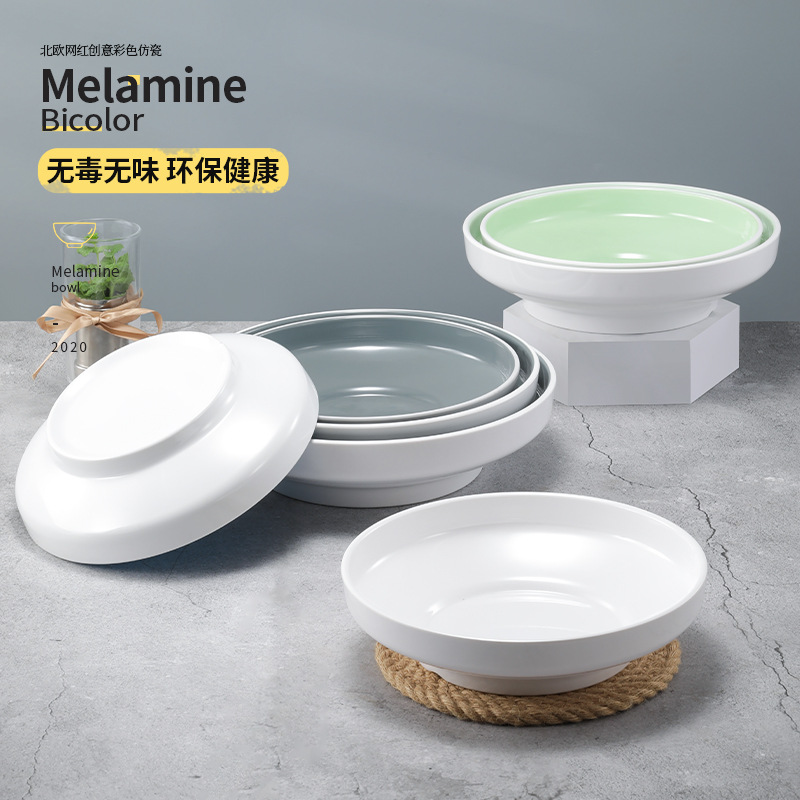 メラミン模造磁器2色深皿レストランホテルスープ皿サラダ皿クリエイティブ円形商用プラスチック食器