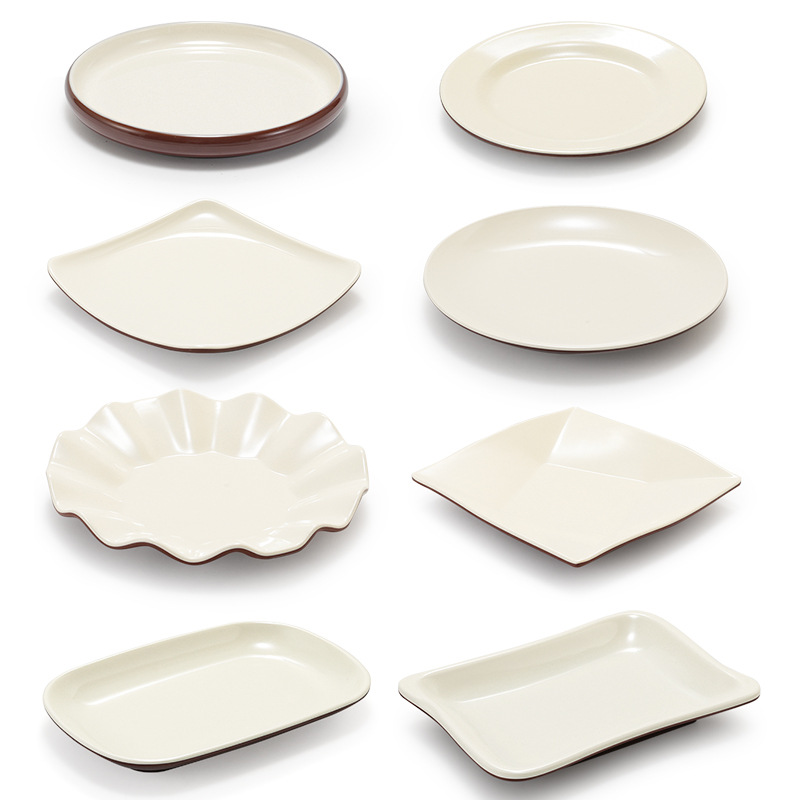 メラミンコーヒー白二色模造磁器円形平皿ホテルレストラン四方炒め皿プラスチック商用食器