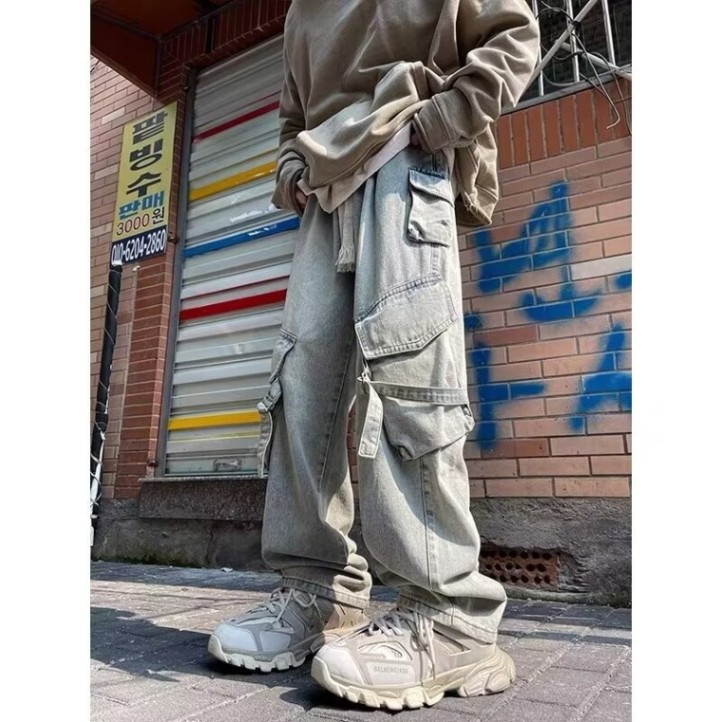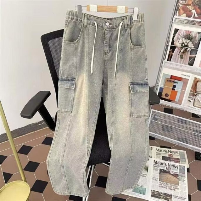 レトロな縄張り工装水洗いジーンズ男女が腰を緩めてカジュアルでゆるいストレートブランドinsマイクロラッパズボン