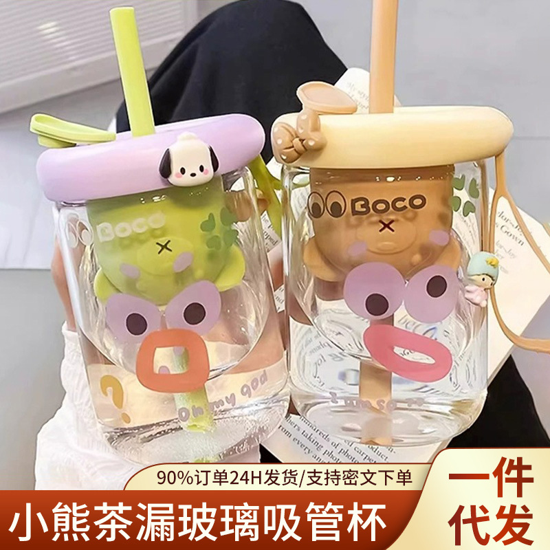 ガラスカップストローカップ蓋付き大容量女の子高颜値耐高温ミルクティーカップ牛乳カップコップコップ