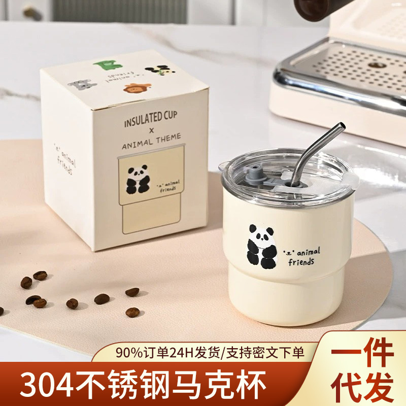 新しいコーヒーカップ女性高颜値二重コップストロー付きステンレスマグカップ蓋付きパーマ防止保温コップ