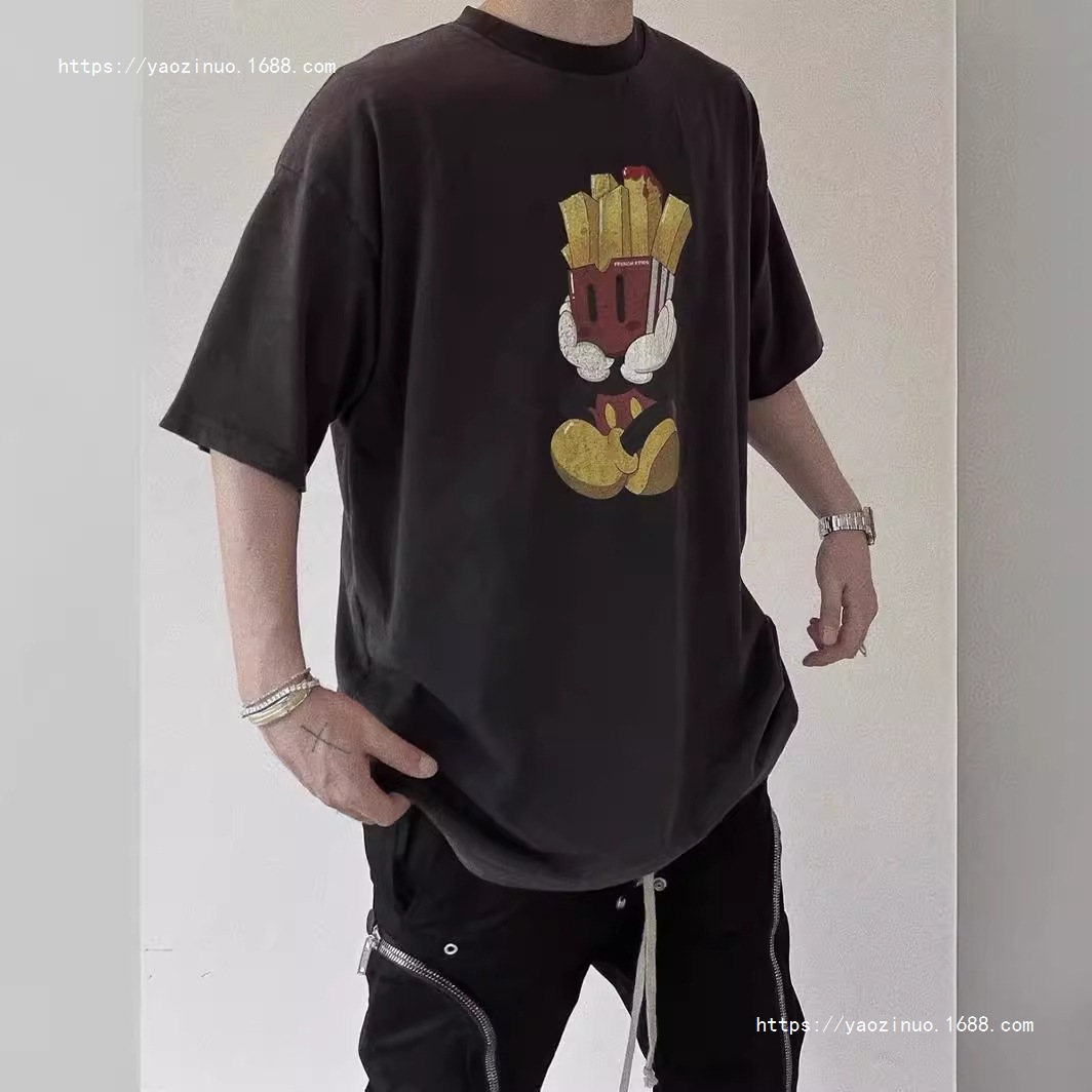 アメリカンファッションハイストリートヒップホップフライドポテトミッキーマイリトルデストラクション漫画プリントカジュアルヴィンテージダメージ半袖Tシャツトップ
