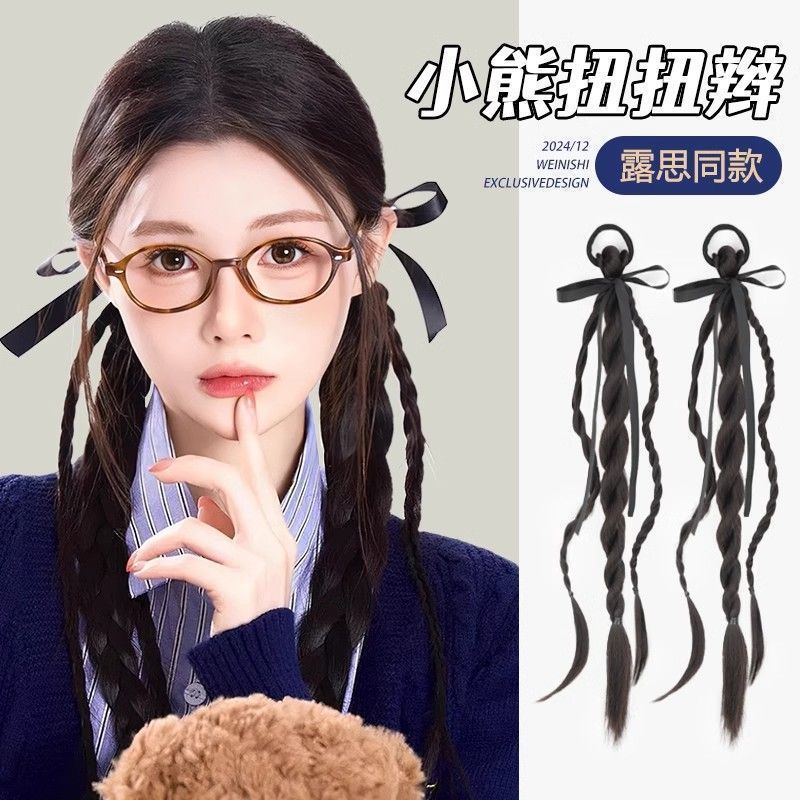 偽のお下げの女性は自然にバレエ風の双麻花の熊のリボンをシミュレーションしてお下げの新しい中国式の学院風の馬尾をねじります。