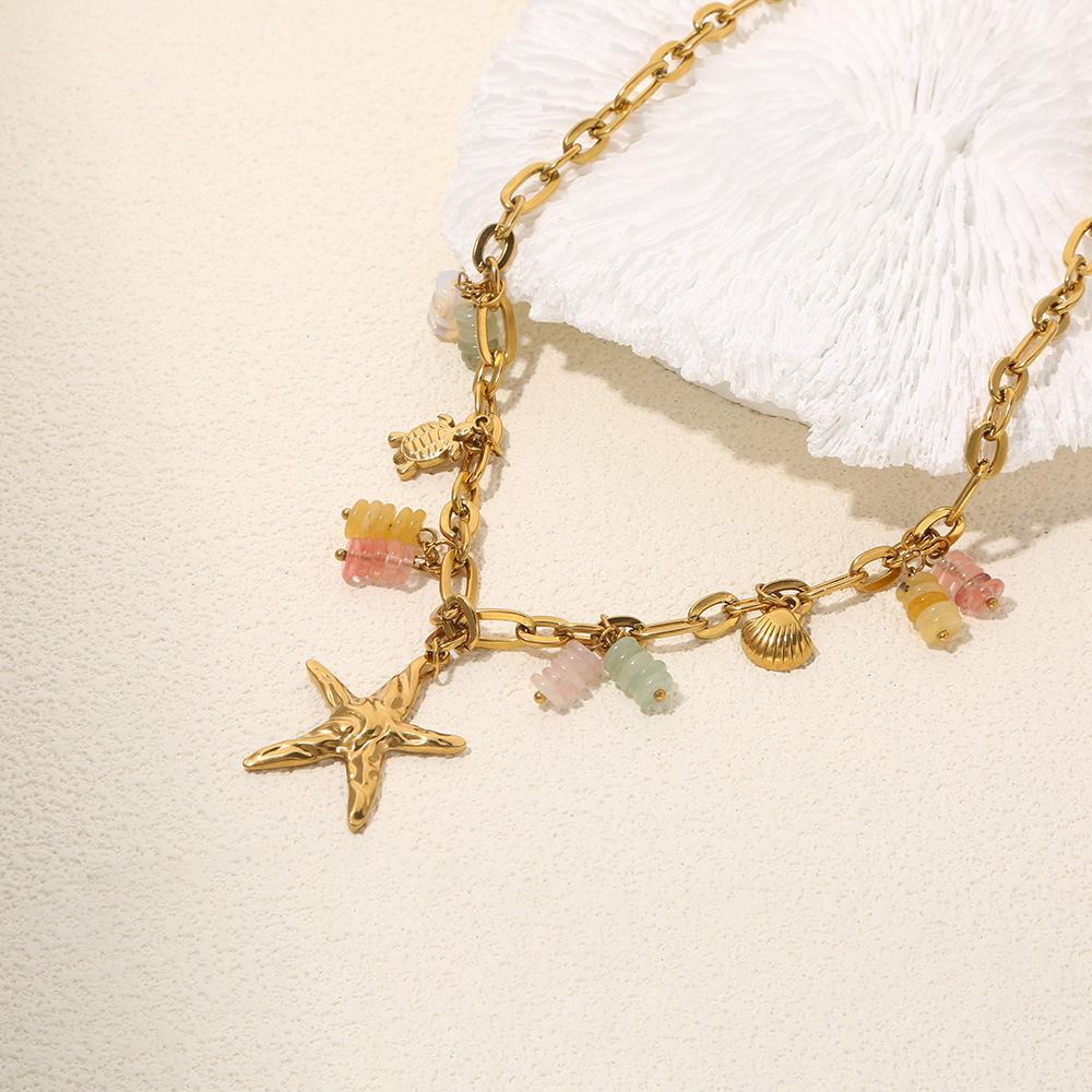 クロスボーダーオーシャンスタイルステンレス鋼ネックレスヒトデウミガメシェルペンダントカラフルなビーズレトロトレンドネックレスジュエリー