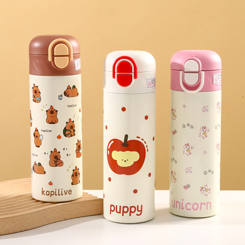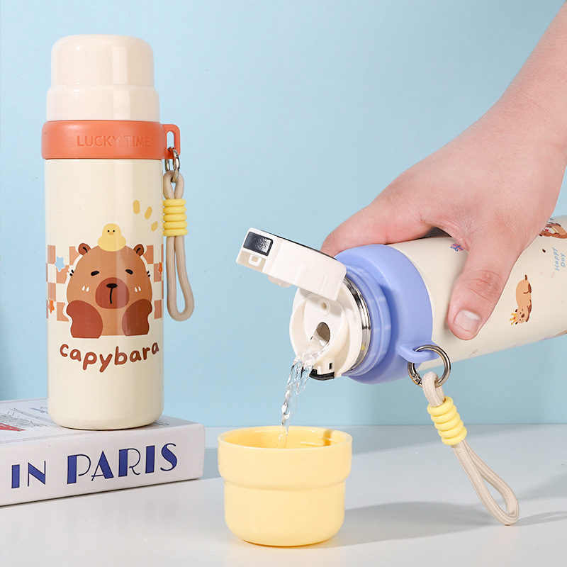 Kapibala 魔法瓶カップ、見栄えの良いステンレス鋼のポータブルストラップストローカップ、1 カップ 3 ドリンク、キュートで楽しいウォーターカップ