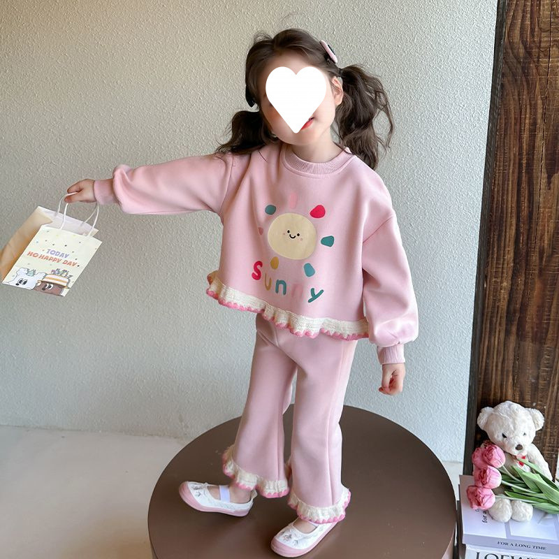 女の子の甘いスーツ春と秋の新しいスタイル子供韓国風ファッショナブルな女の子ファッショナブルなレースフレアパンツ 2 点セット